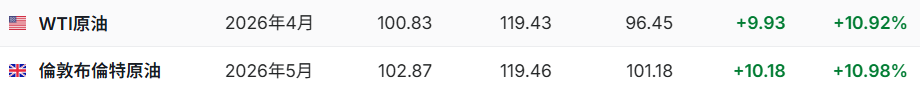 3. 截至发稿,WTI原油涨10.92%,报100.83美元/桶。布伦特原油涨10.98%,报102.87美元/桶。