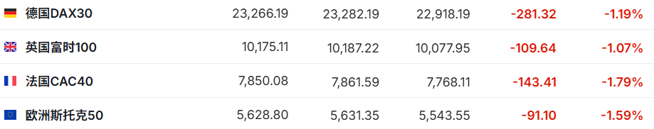 2. 截至发稿,德国DAX指数跌1.19%,英国富时100指数跌1.07%,法国CAC40指数跌1.79%,欧洲斯托克50指数跌1.59%。