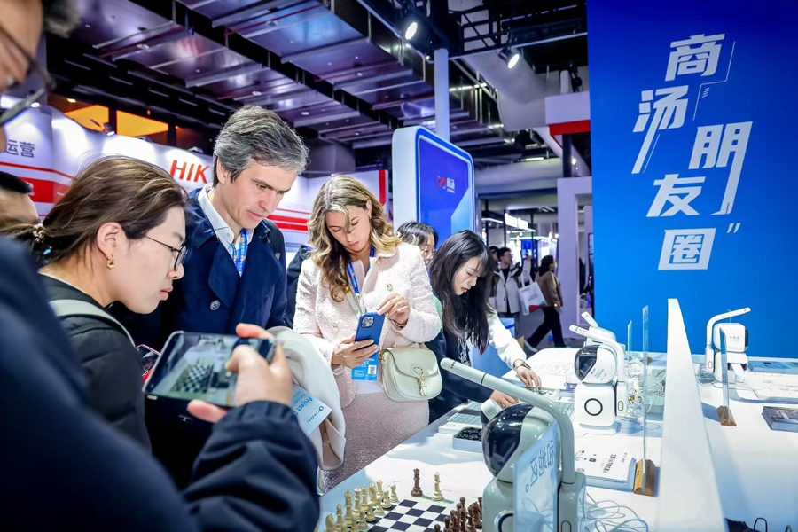 有见所未见的兴奋。在宇树、MiniMax等展台,当韩国客人Jenny看到机器人、机器狗能灵活避障、从容交互时,不由感慨,中国具身智能的技术实力与进步速度,已完全超越她的预期。有相同感受的是印尼采购商Eric。在商汤生态展区,他被商汤大模型赋能的终端吸引。这里有儿童AI学伴“灵宇宙小方机”,有带来对弈乐趣的AI下棋机器人“元萝卜”,还有24小时在线的情绪搭子“Fuzozo芙崽”。尤其当Eric获知这些产品都有10万+的出货量时,他眼神兴奋中带着复杂,因为在他自己的国家,AI还只是难懂抽象的技术,中国却已具像到如此广泛的应用了。