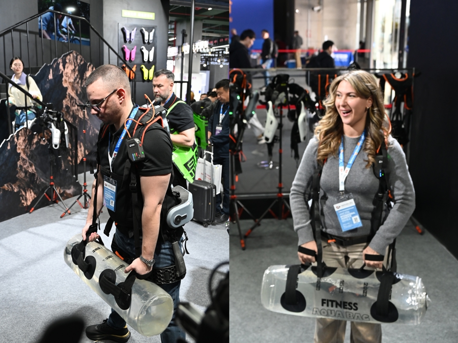 更多客商的眼神中,带着“入伙”的渴望。一位罗马尼亚客商仔细记录下产品参数,他想把中国机器人引入当地酒店和工厂。另一位德国客商则计划将一款可飞行52个小时的工业级无人机引入家乡的果园,用于播种、施肥或喷洒农药。而在傲鲨智能展台,公司市场合伙人张华此次批量邀请了近20位海外客户。“我跟他们说,今年1月在拉斯维加斯CES展(2026年国际消费电子展),傲鲨还是保守了些。但这次你们来中国,一定给你们看绝活。”果然,一位说来就来的欧洲客户,穿上傲鲨一款工业级机械外骨骼。在AI助力下,他轻松拎起25公斤重的水桶。他说:“让我成为傲鲨的partner吧!我要把这些从来没见过的产品带到欧洲市场。”