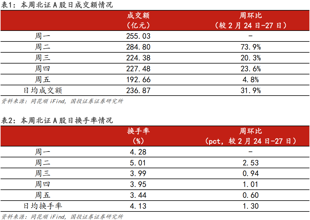 流动性方面,本周北证A股总成交额为1184.36亿元,北证50总成交额358.75亿元,占北证A股总成交额的30.29%。北证A股日均成交额236.87亿元,较2.23-27上涨31.9%。区间日均换手率为4.13%,较2.23-27上涨1.3pct。