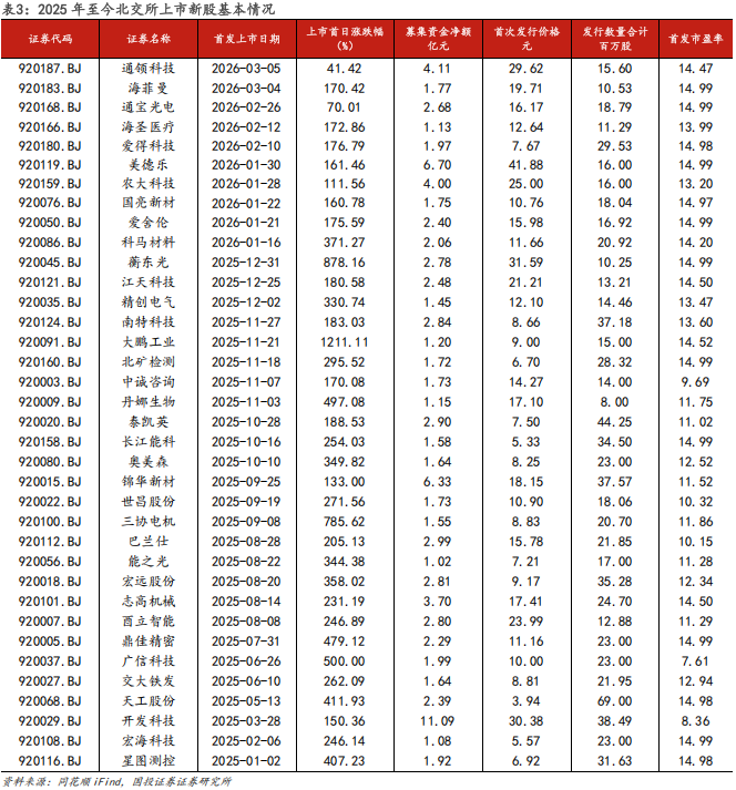 2025 年 1月1日至2026年3月6日,北交所共有36家企业新发上市,本周新上市两家,分别为通领科技和海菲曼,上市首日涨幅为41.42%/170.42%,36家新股上市首日涨跌幅中位数246.52%,市盈率中位数14.10X。
